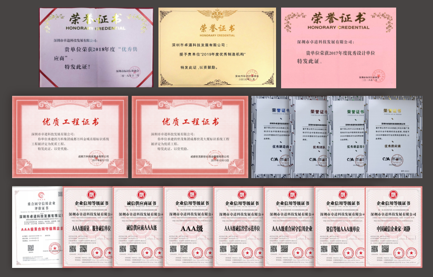 公司历经八年的发展,不断壮实自身,公司努力进取,在卓道人的共同拼搏下,先后获得了质量管理体系认证、环境管理体系认证、建筑业企业资质证书(钢结构工程专业承包三级,建筑装修装饰工程专业承包二级)、惠州生态环境管理局惠阳分局环保批文以及多项标识相关领域专利。公司始终秉持客户至上,为更好的服务客户,提升客户满意度,在严抓产品质量的前提下,好的售后服务也必不可少。